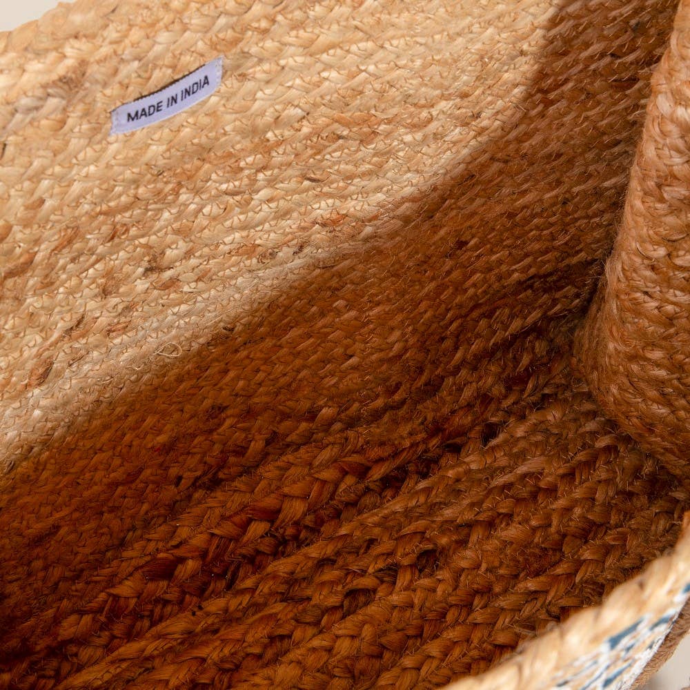 Bold and daring, this tote bag comes with a special blue and white intricate print jute design. This item is perfect for adding some color and vibrancy to any outfit. Wooden Bead Tassel This tote bag approximately measures: Length: 16 Inches Height: 13 Inches This tote bag is made with Jute.