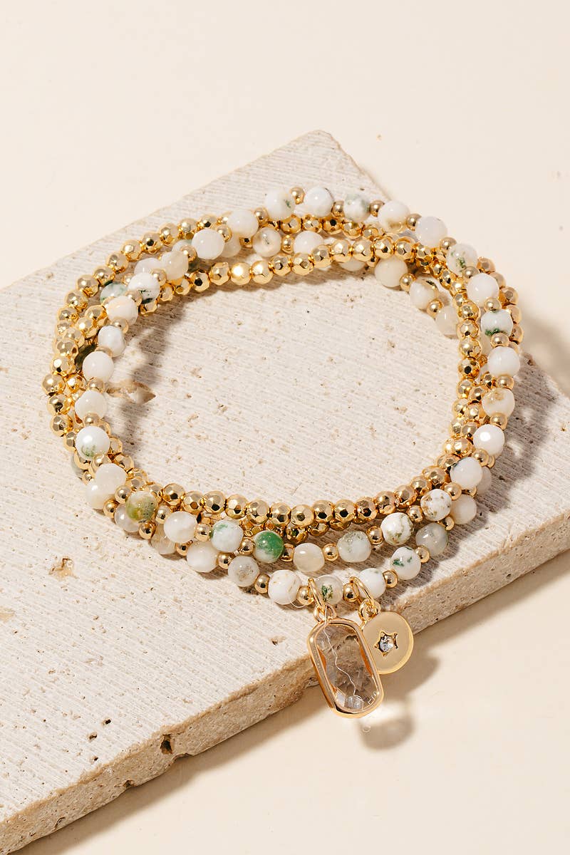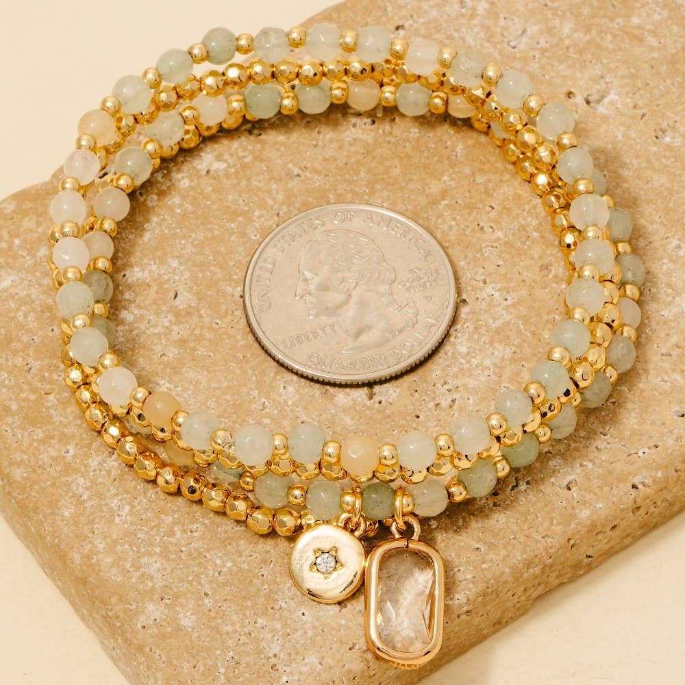 A versatile and stylish addition to any wardrobe, this bracelet incorporates a flawless rectangle gem and disc charm beaded set design. Add a dash of sophistication to your look with this versatile bracelet, a must-have for fashion enthusiasts.