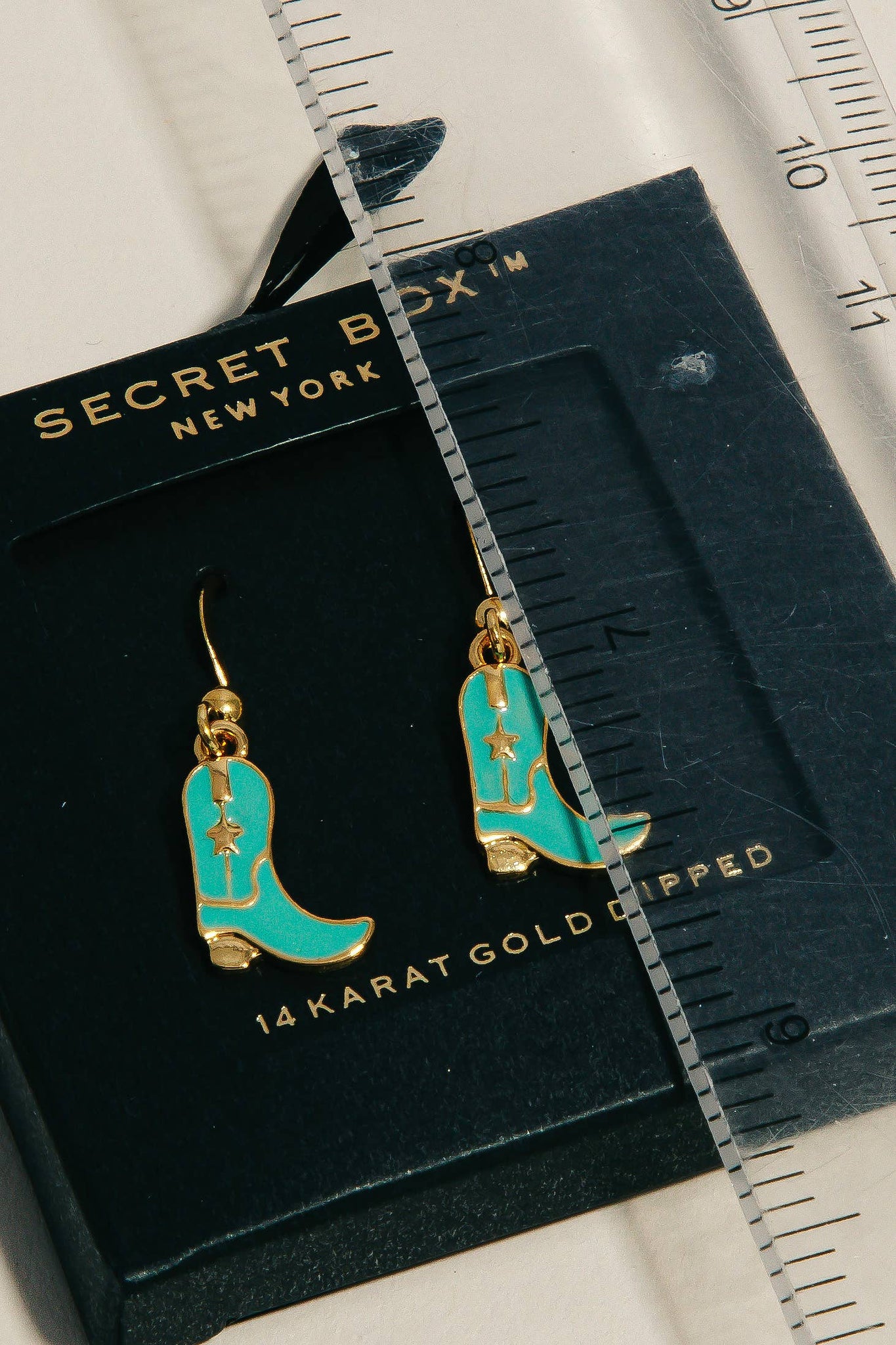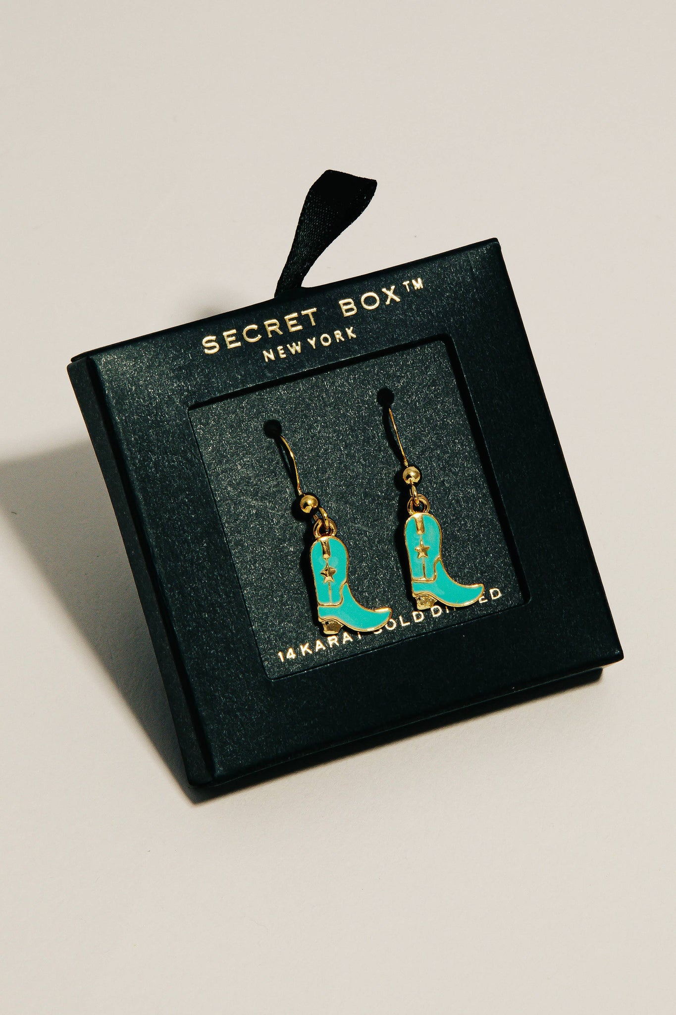A timeless piece that will never go out of style, this pair of gold dipped earrings comes with a special secret box cowboy boot earrings design. Perfect for any occasion, this versatile pair of gold dipped earrings will enhance any outfit you wear. This pair of gold dipped earrings is made with 90% Brass and 10% Epoxy.